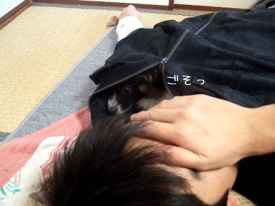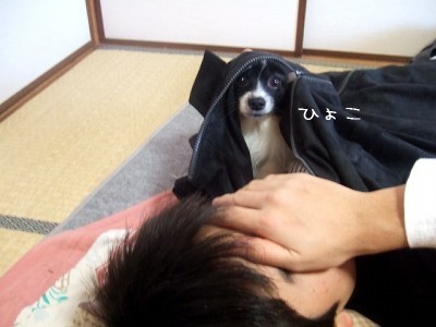 洋服から覗いているコハクは少しビックリ顔ですね^^;