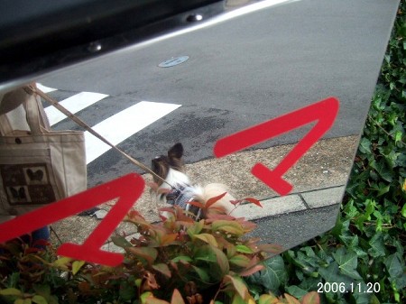 お散歩中、信号待ちしているときにお店の看板に映ったコハクを激写。