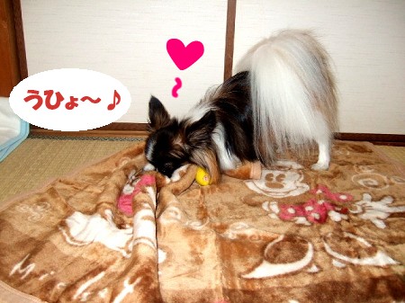 大好きな風吹の匂い付き毛布はコハクにとって最高のプレゼントなのでした。