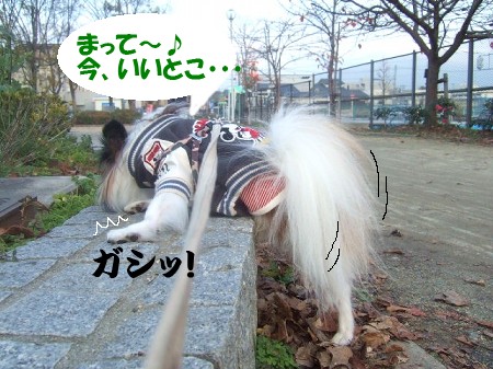リードを引いてやめさせようとしても手でしっかり踏ん張っています。