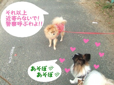 散歩中、ポメラニアンの女の子を気に入ったようで猛烈アタックをするコハク。