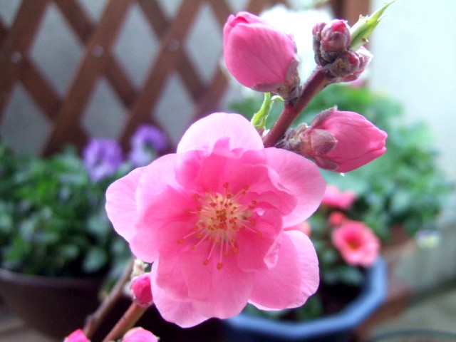 ベランダで桃の花が咲いています。