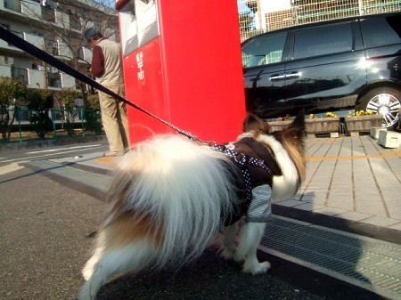 コハクの足は郵便局の入口に向いています(笑